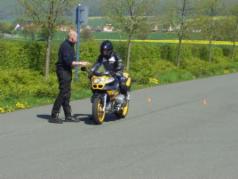 Zum einen aus den einzelnen Trainingseinheiten, die auf geeigneten Plätzen absolviert werden. Hier werden dann die Übungen, die aus dem Sicherheitstraining bekannt sind, wie Sitzposition, Blickführung und Gefahrenlehre besprochen sowie, je nach Schwerpunkt des Kurses noch, langsamfahren, bremsen, lenken, oder ausweichen trainiert. | |